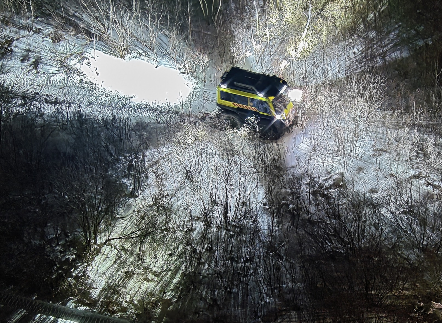 We utilized a new tactic we showcased a couple weeks ago with one drone searching for the patient and providing a general overview of the incident, and a second drone operating from within the FAT Truck providing pathfinding and “halo” operations.
